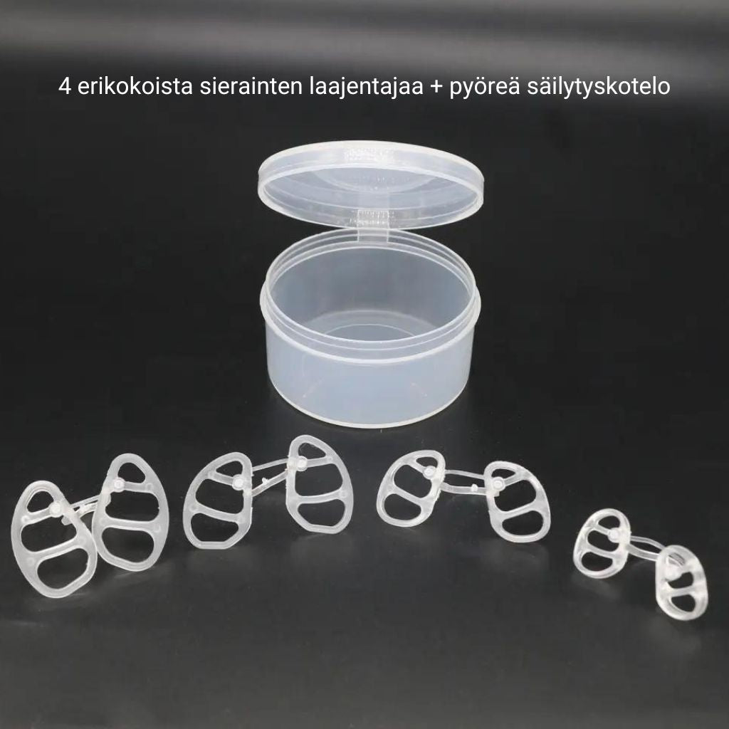 Pyöreä sieraintenlaajentaja täydentää paketin avaamalla nenän ilmankulun. Herkkänenäisille suunniteltu pehmeä silikonirakenne vähentää ärsytystä, mutta tekee silti sen, mitä pitää: lisää ilmaa, vähentää suuhengitystä ja helpottaa tukkoisuutta. Kun nenä toimii, koko hengitysketju toimii.